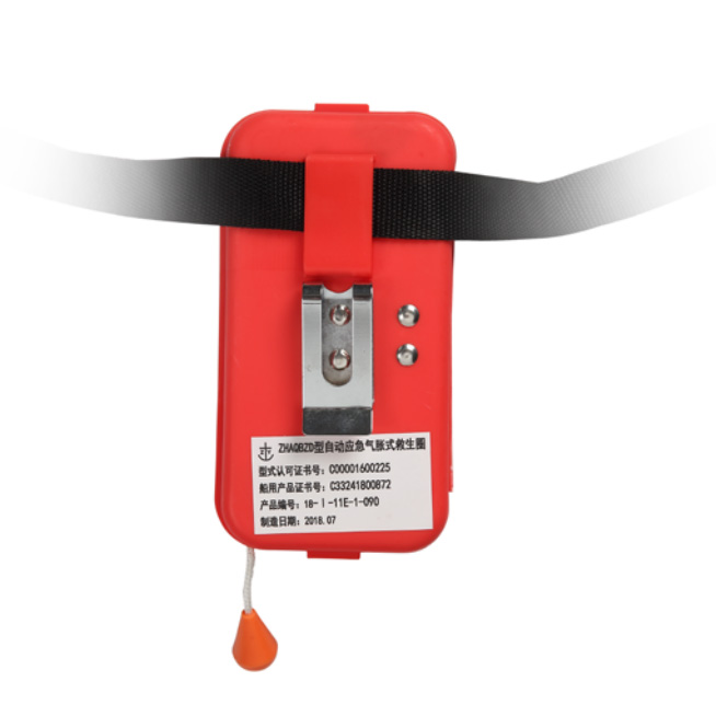 .사용시 외부 상자를 벨트에 고정하기만 하면 됩니다. 외부 상자를 고정하는 방법에는 두 가지가 있습니다. 하나는 금속 버클을 벨트에 직접 삽입하는 것이고, 다른 하나는 벨트 구멍을 통해 벨트를 고정하는 것입니다. 구명 부표는 자동 팽창식이며 수동으로 팽창시킬 수도 있습니다. 물과 접촉하면 5초 이내에 자동으로 팽창 및 팽창하여 인명구조 역할을 하는 말굽 모양의 구명부표를 형성할 수 있습니다.