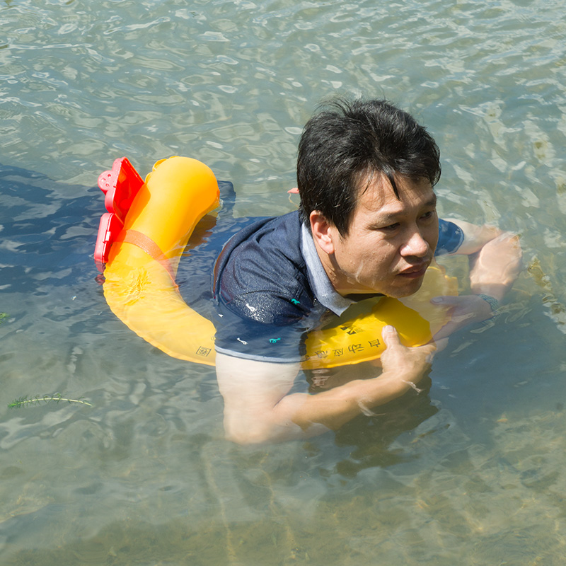 입 부는 공기 튜브는 기 및 수축에 사용됩니다. 물 속에서 떠 있는 시간이 너무 길고 공기실의 가스가 부족하면 입으로 공기를 불어 보충할 수도 있습니다. 구명부표가 팽창된 후 공기실의 가스를 방출하려면 입으로 불어오는 파이프의 체크 밸브 풀을 손가락 끝으로 누르고 아래로 눌러 공기를 방출하십시오.